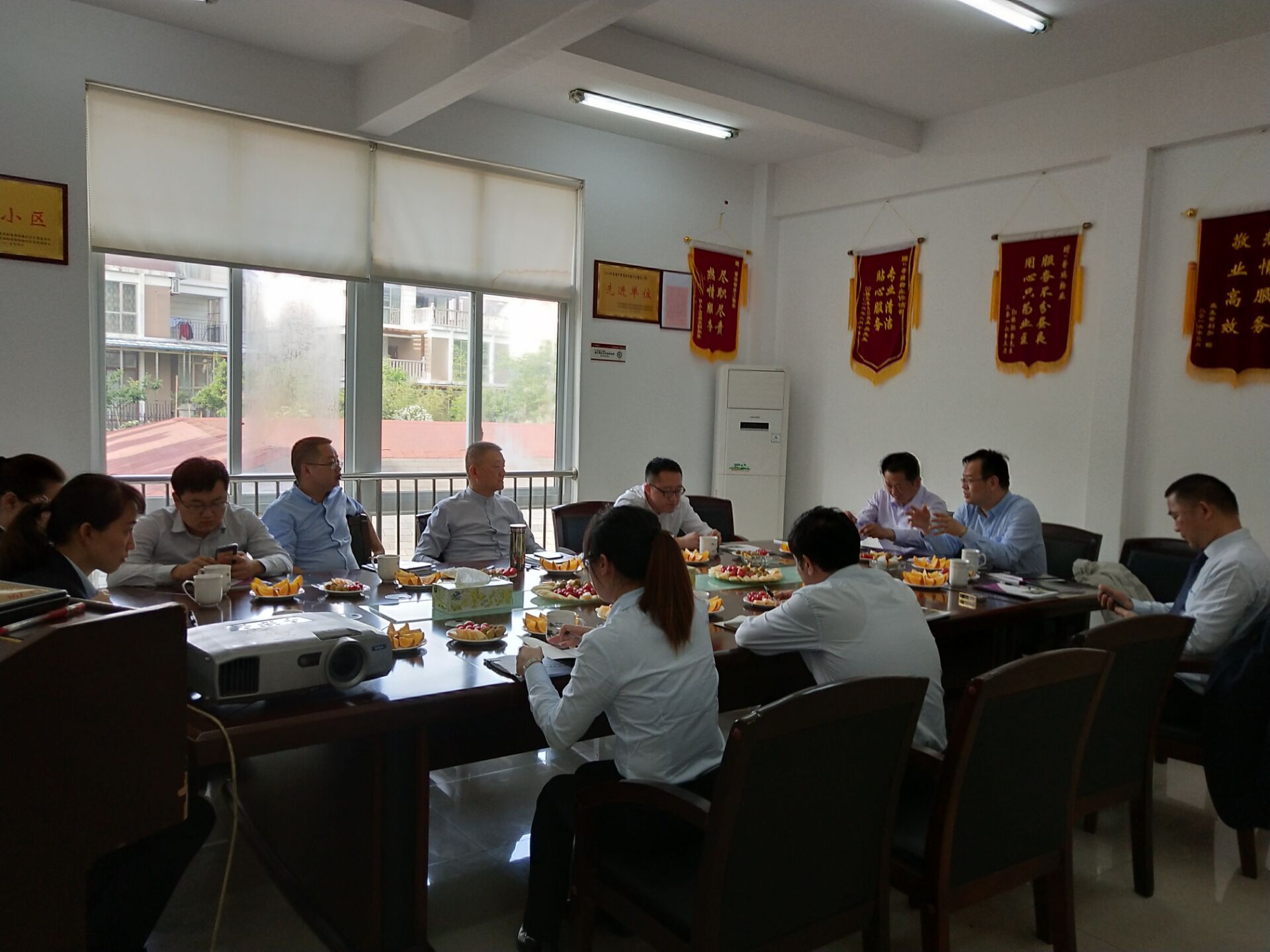 4月18日,湖南省房地产业协会常务副会长、秘书长宋泷、湖南省房地产业协会物业管理专业委员会秘书长肖斌斌、副秘书长甄虹捷、周金强一行四人,来到公司项目普瑞斯堡进行公司年度评优指导。此次会议中,宋会长对公司在行业内取得的成绩表示肯定,对星级评定工作进行了专业指导。实业公司党支部书记兼普瑞物业公司董事长刘召伟、实业公司总经理杨慧明、普瑞物业公司总经理曹艳雄参加会议。